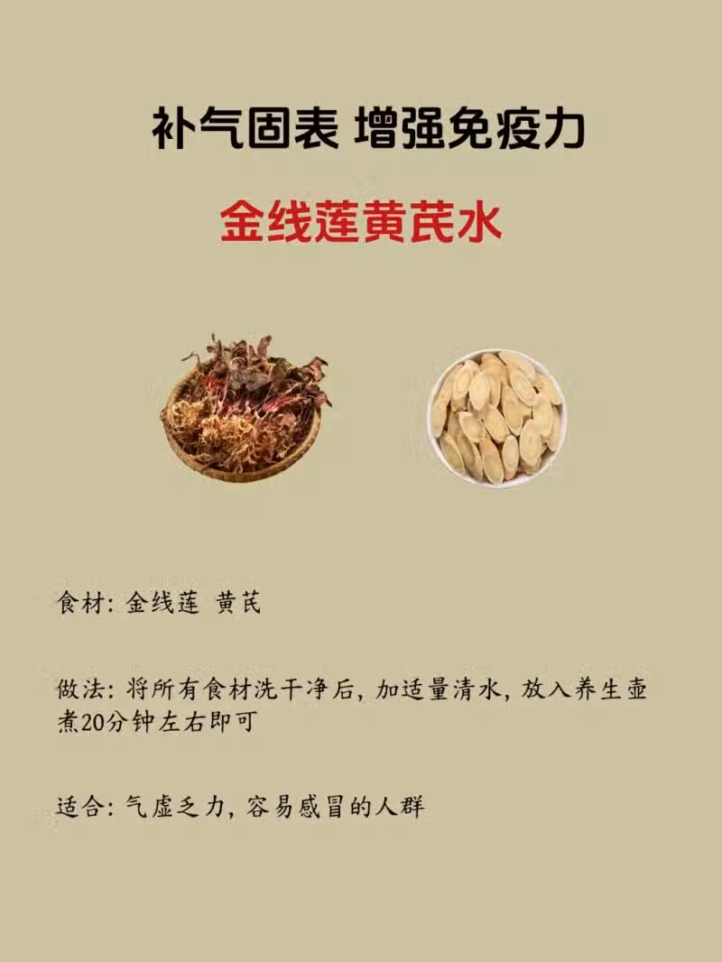 黃芪補氣固表,搭配金線蓮,提升免疫力,幫助身體抵禦外邪,適合容易感冒、咽喉反覆發炎的人。