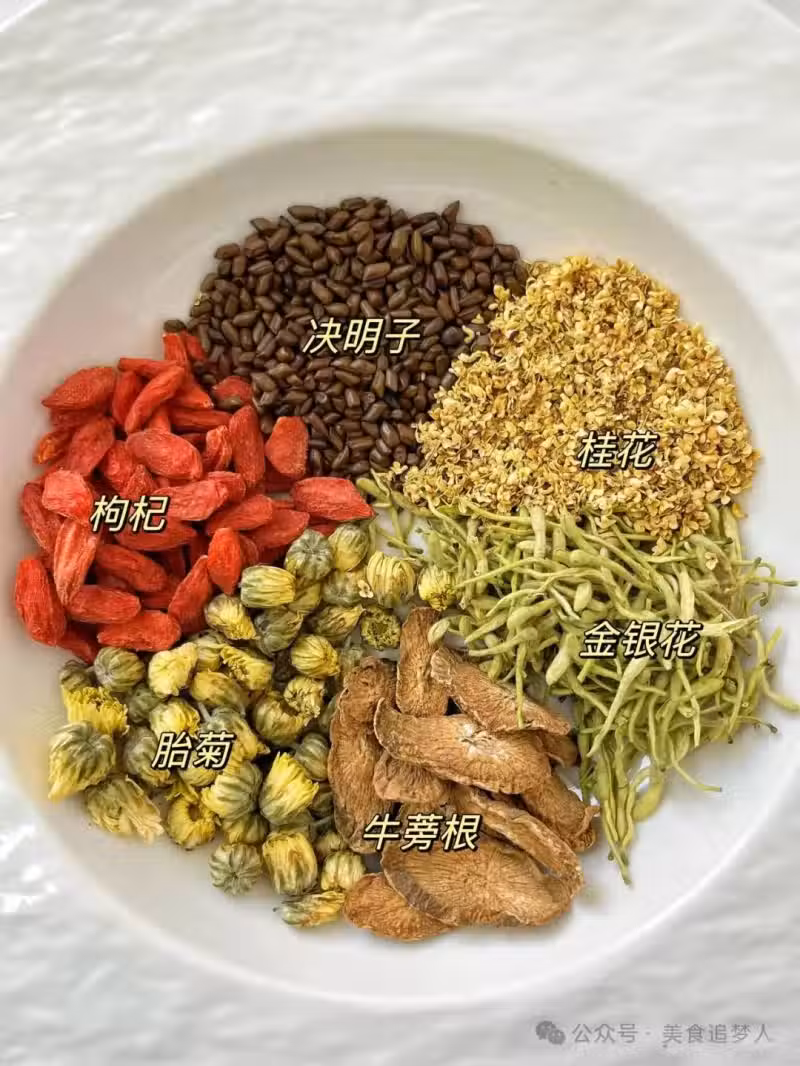 食材:金銀花2g、牛蒡根3片、菊花10朵、桂花2g、決明子4g、枸杞10顆