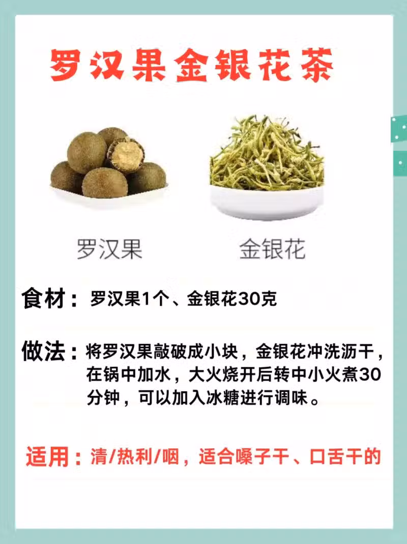 金銀花清熱解毒,與羅漢果共泡,茶香中帶著絲絲清甜。此茶能有效撲滅肺部「小火苗」,改善因肺熱引起的咳嗽、痰黃等問題,讓呼吸更順暢。