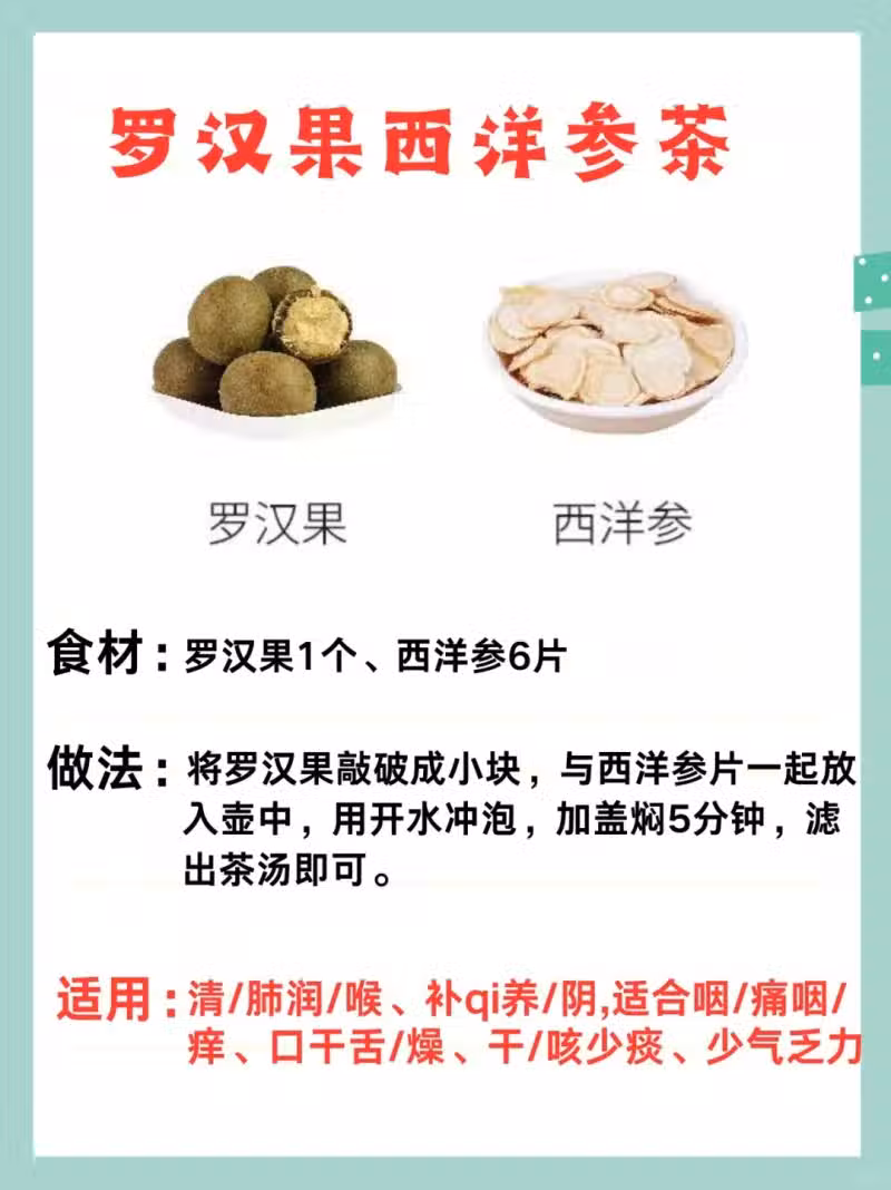 西洋參補氣養陰,與羅漢果組合,既能潤肺又能增強體質。適合肺虛久咳、氣短乏力的人群,飲用後元氣滿滿,呼吸道也倍感舒適。