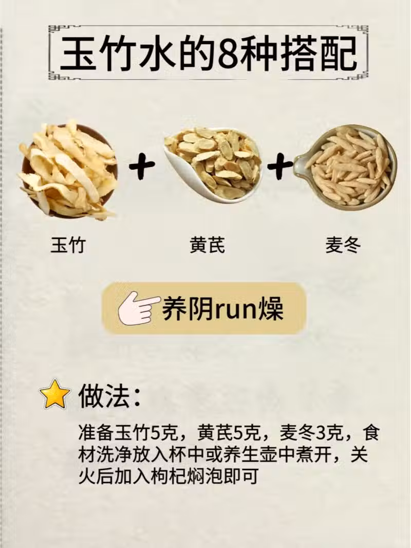 5. 玉竹+黃芪+麥冬:養陰潤燥,乾燥的季節里,也能讓你皮膚水嫩,嗓子舒服 。