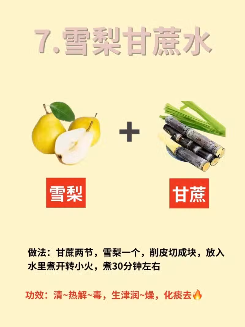 7.雪梨甘蔗水:清~熱解~毒,生津潤~燥,化痰去🔥