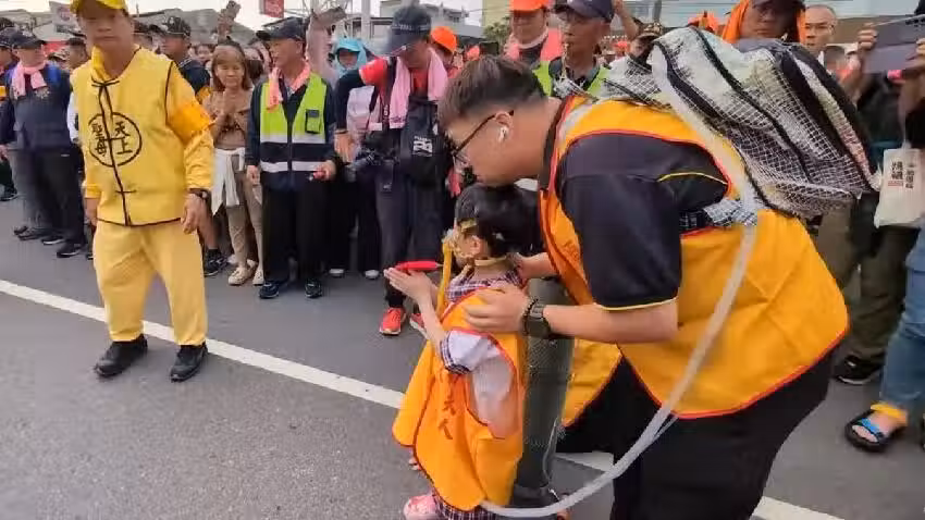 據《TVBS新聞網》報導,這個孩子因先天性肺部缺陷,必須全天候依靠氧氣瓶維持生命,爸爸帶著女兒向白沙屯媽祖跪下祈福,場面令人動容...只見父親一手攙扶著女兒,一手小心翼翼地拿著氧氣瓶,氧氣管線連接著女童的鼻子,而媽祖鑾轎就在此時,突然停下腳步,改變原本路線,直接朝著這位小朋友而去,溫柔駐足長達30秒...