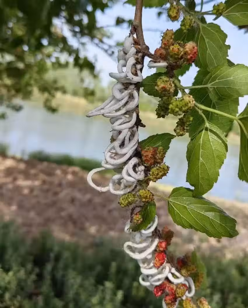 桑樹枝間密密麻麻纏著團團白色去殘留,像是隨意拋撒的脫脂棉,