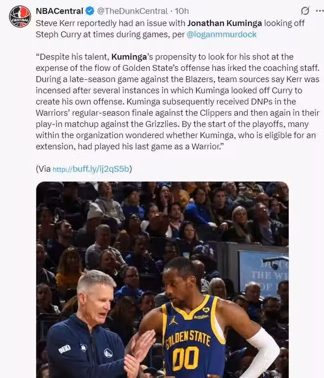 就在G5賽前,據NBA記者Logan Mmurdock報道:即使勇士深知庫明加天賦過人,但他在進攻端過度專注於為自己尋找出手機會,這種行為在一定程度上犧牲了勇士流暢的整體進攻體系,這無疑讓主教練科爾大為惱火。除此之外,他還化身球隊的「球霸」,在進攻端無視庫里的跑位,並且拒絕給當家球星做球,由於種種不理智、且無視團隊戰術的「攪屎棍」的行為,也為他之後迷茫的處境,立下了汗馬功勞。至此,庫明加開啟了被DNP的職業生涯。