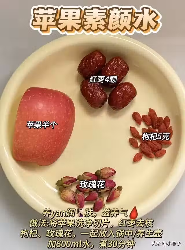 食材:紅棗4顆|蘋果半個|枸杞5g|玫瑰花3朵。