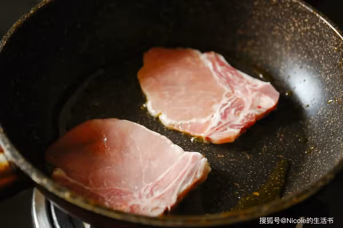 3、小火煎至肉變色,翻面,繼續小火煎熟,盛出豬排待用;