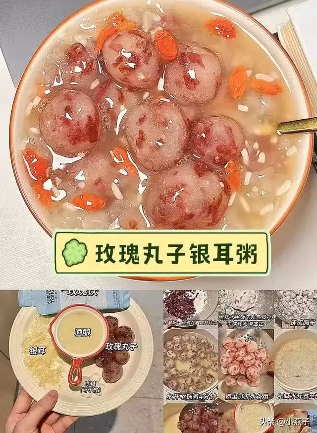 做法:玫瑰丸子煮4分鐘過涼水→銀耳煮出膠→加丸子和酒釀煮開,