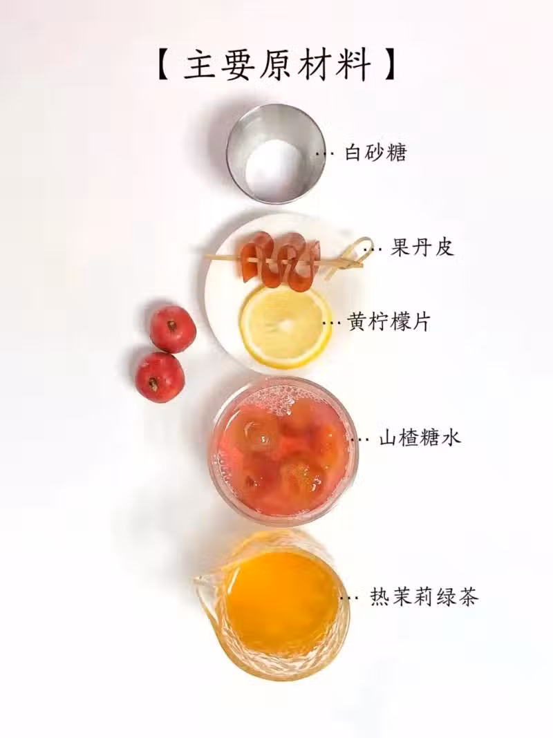 熱茉莉綠茶100-120ml 山楂糖水60-70ml 黃檸檬1片 白糖2g 果丹皮一小片