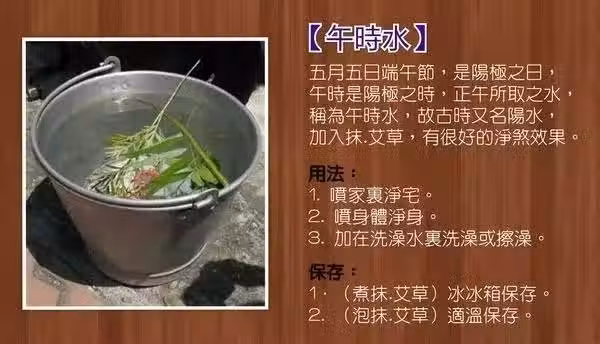 從天地五行來看,重午日干支是雙重極盛的陽火,就是「純陽」日。 重午日的午時,陽上加陽,所以「午時水」有「極陽水」之稱。 午時水極陽剛的神奇,就是從天地運轉、陰陽五行的消長變化的道理而生。 夏天陰弱陽盛、冬天陽衰陰盛,各人身體也都能明顯感受寒暑陰陽五行的差異。 從天地陰陽的變化看「午時水」的效用,也就容易理解其中的道理。 【午時水的製作方法】時間:端午節,公曆2025年5月31日,農曆五月初五,當日午時(上午11點到下午1點)。