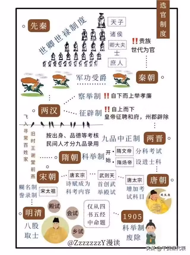 此外,還有武舉,這也是武則天的首創,最著名的武狀元是郭子儀。唐期時武舉很重視武藝,只要練得一身好本事,就能考中,到了宋朝,就加入了軍事策略,明清時軍事策略招過了武藝,先謀略,後武藝,武藝過得去就行。