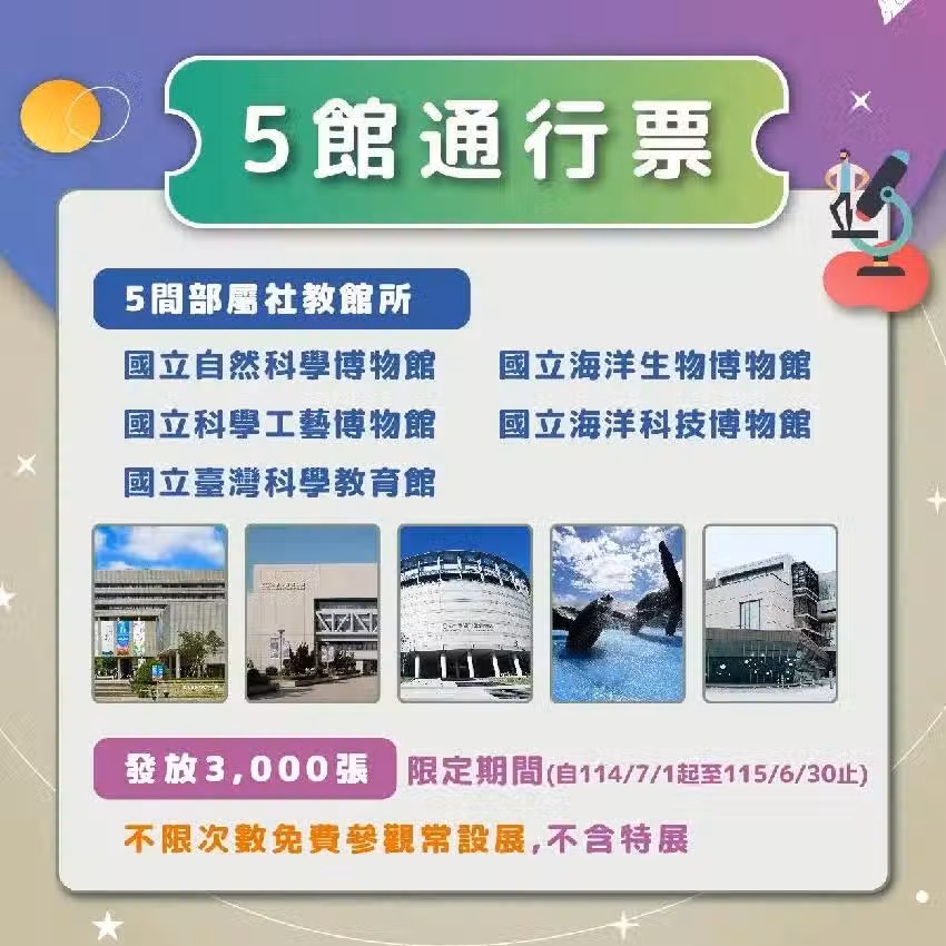 「5館通行票」則提供國人免費進入國立台灣科學教育館、國立自然科學博物館、國立科學工藝博物館、國立海洋科技博物館及國立海洋生物博物館,使用期限為7月1日至2026年6月30日止。