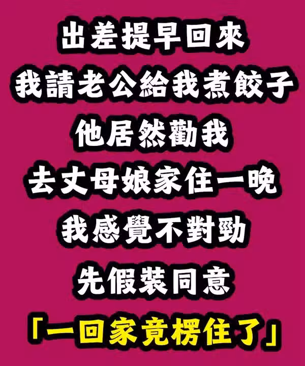 出差提早回來!我請老公給我煮八顆餃子,他卻勸我「去丈母娘家住一晚」 我感覺不對勁,先假裝同意「一回家愣住了」