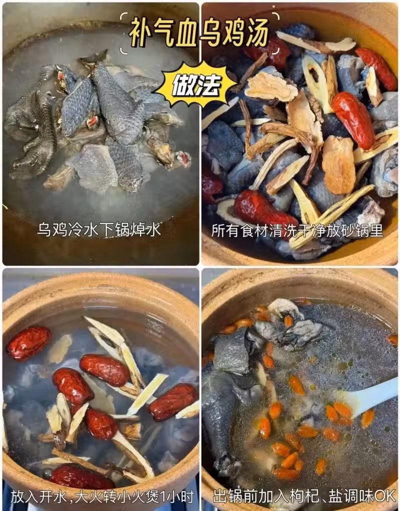 ③將藥材與烏雞放入鍋中,燉煮一小時,加入適量的鹽調味,其他的什麼都不用加。