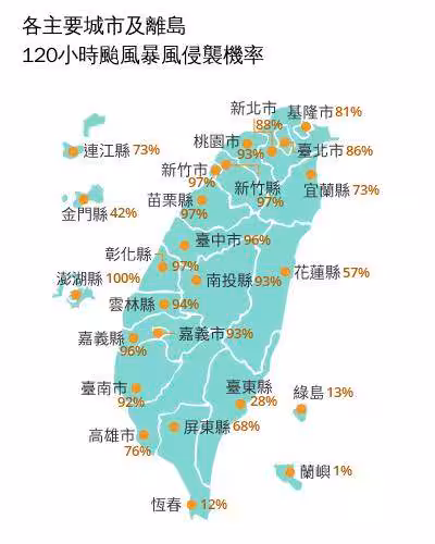 據中央氣象署今晨最新發布的120小時颱風暴風圈侵襲機率,突破90%以上的縣市包括:桃園市、新竹市、新竹縣、苗栗縣、台中市、彰化縣、南投縣、雲林縣、嘉義縣、嘉義市、台南市及澎湖縣,其中首當其衝的澎湖縣高達100%。