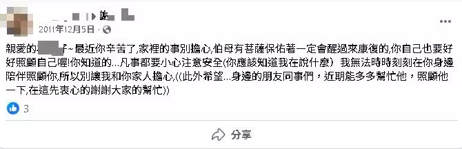 謝男也會一一回應,「沒問題」、「放假就載你去你說的地方走走看看吧」、「好看!想換就換啊」。甚至2011年謝男疑似家中長輩有狀況時,張妻除了發文鼓勵,還喊話謝男身邊的朋友,「希望近期能多多幫忙他,照顧他一下,在這先衷心的謝謝大家的幫忙」。