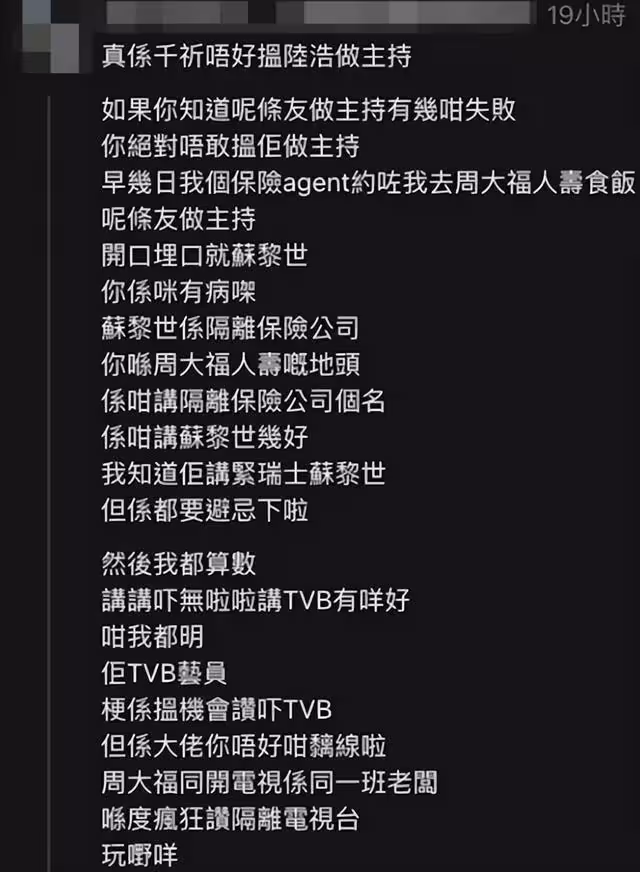 這位網友在長文中憤怒寫道:「你是不是有病?蘇黎世是隔壁保險公司,你在周大福人壽的地盤,不停講隔離保險公司的名!」更讓人哭笑不得的是,陸浩明似乎完全沒意識到自己的失誤,仍在台上滔滔不絕,甚至提到TVB和ViuTV的優點,唯獨漏掉了與活動主辦方關係密切的HOY TV。