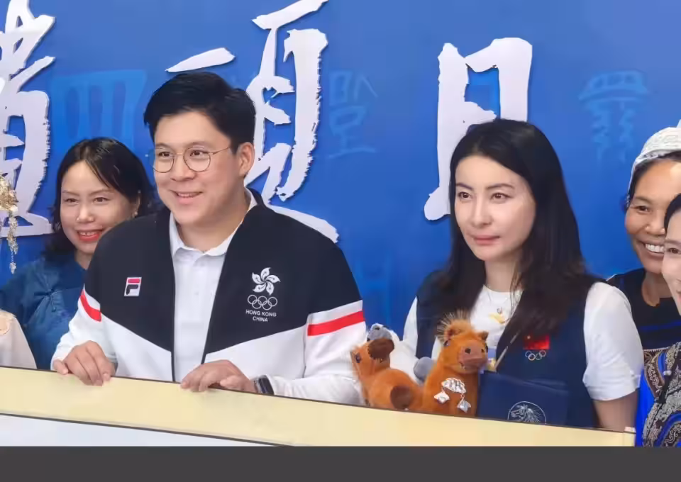郭晶晶一家五口在貴州,俯身握手一點沒架子,衣服logo顯愛國情懷
