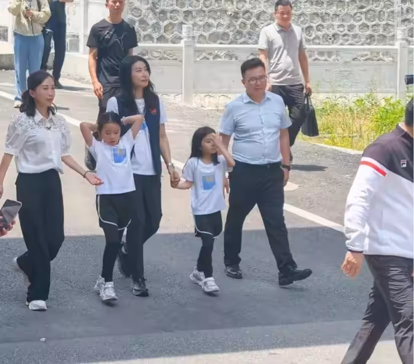 郭晶晶一家五口在貴州,俯身握手一點沒架子,衣服logo顯愛國情懷