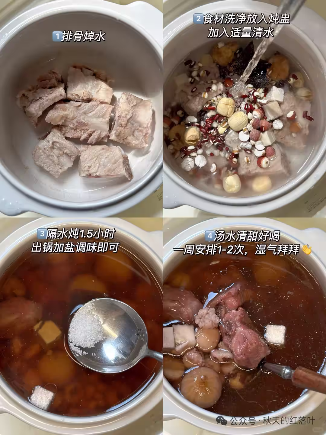 【做法】排骨焯水放入燉盅 其他食材洗凈也放入燉盅 加水,隔水燉1.5小時 出鍋加鹽調味即可(湯水好喝👍)