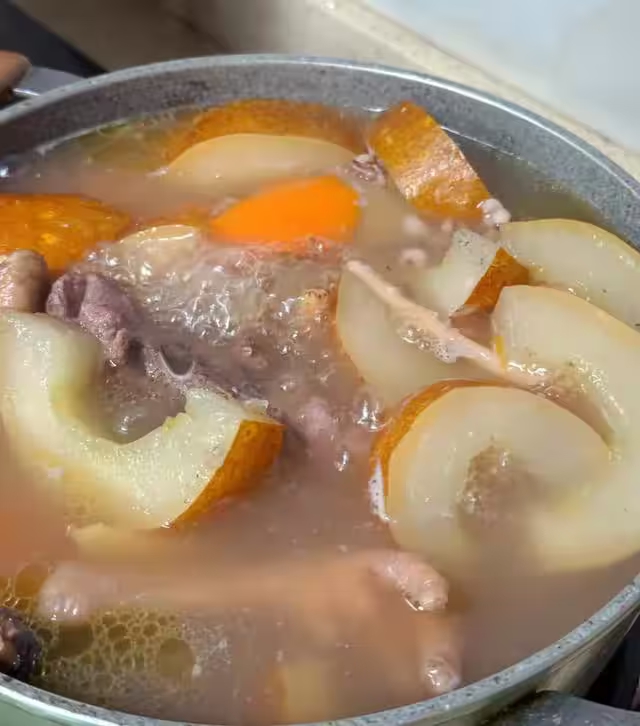 老黃瓜、胡蘿蔔、豬骨、雞腳、薏仁、赤小豆、無花果、玉竹、沙參、陳皮、薑片;