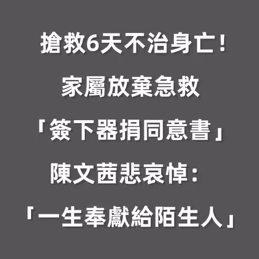 搶救6天不治身亡!家屬放棄急救「簽下器捐同意書」 陳文茜悲哀悼:「一生奉獻給陌生人」