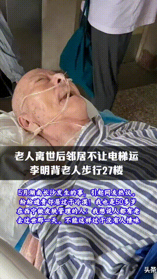 在視訊中,長沙一位老人去世,他的孩子打算用電梯運送遺體,但遭樓下鄰居阻攔。