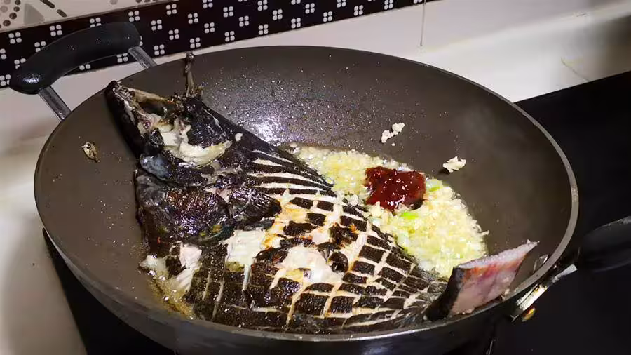 買回來的牙片魚商家已經處理好,簡單地沖洗即可,然後在背部和腹部分別打花刀,背部打十字花刀,腹部打一字花刀,然後加薑絲、胡椒粉、鹽和料酒腌制一下,目的是更好地去腥和入味;起鍋加油,油溫五成熱放入牙片魚,一面煎制金黃翻面,兩面都煎制金黃,放入姜蒜炒香,炒香後加入一勺黃豆醬炒香,然後倒入生抽,一點老抽調色,一點鹽,1勺白糖,適量的蚝油,
