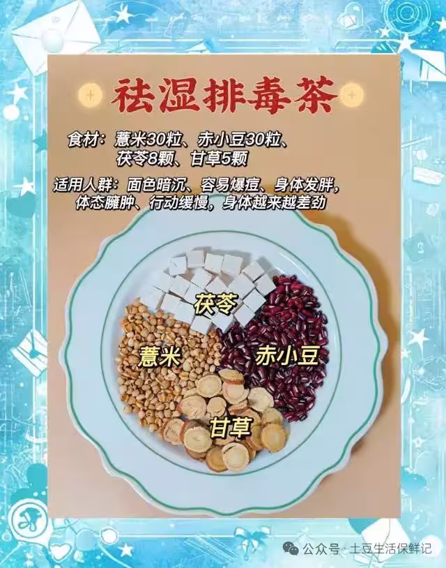 薏米被譽為「祛濕聖品」,能利水消腫、健脾止瀉,與茯苓搭配可強化健脾祛濕的功效。取茯苓20克、薏米30克,提前浸泡1小時後加水煮至薏米軟爛,濾渣取汁飲用。這款茶適合夏日出汗多、下肢易水腫的人群,能通過健脾促進水濕排出,改善因濕濁內阻導致的腸道不暢,讓身體從內到外保持通透。