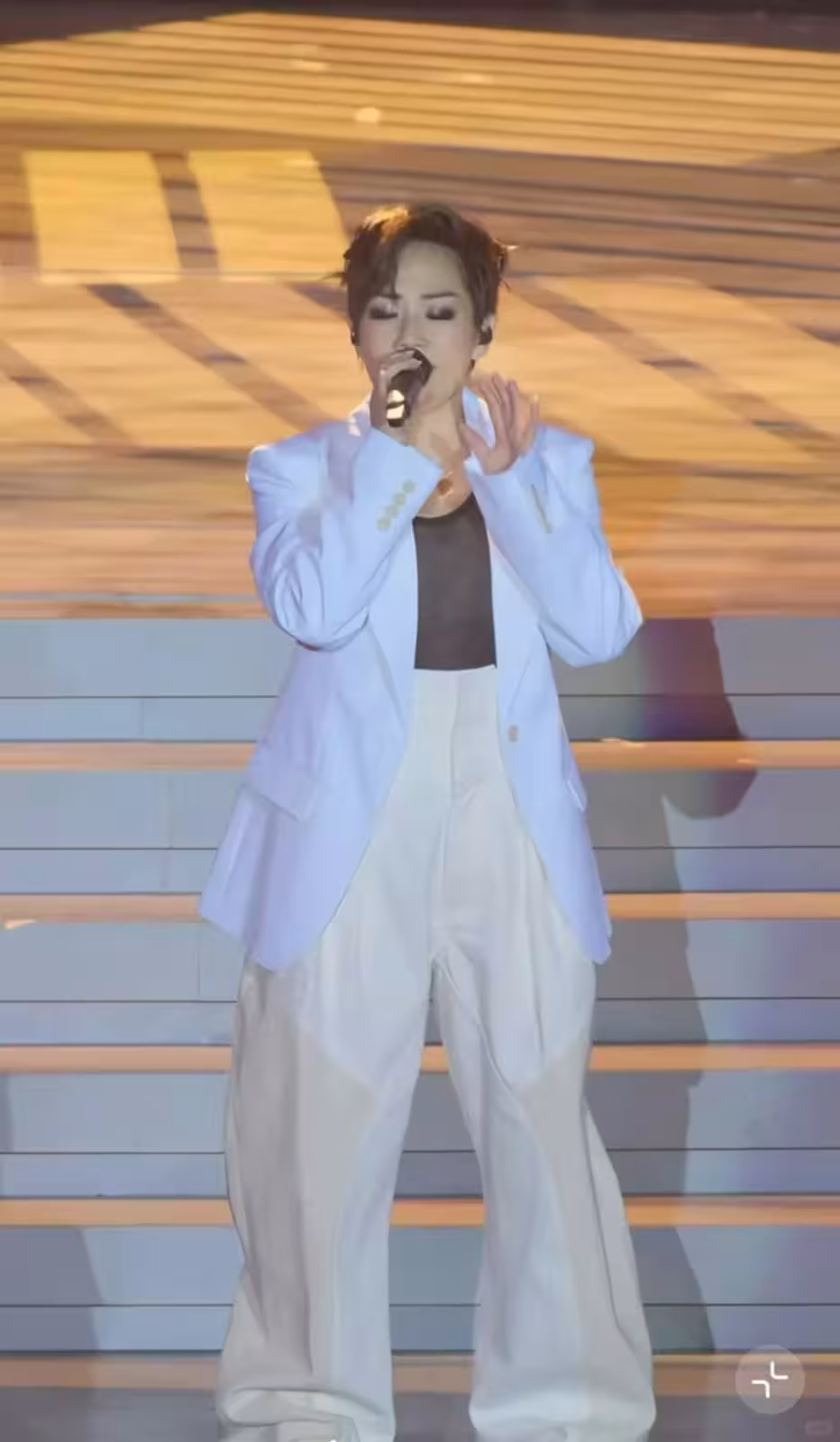 照片顯示,林憶蓮以一頭俐落短髮示人,演出服裝則以淡粉紫西裝外套、純白西裝寬褲,展現鮮艷色系的大膽穿搭風格,盡顯天后風采。不過,林憶蓮的身形、臉部狀態似乎與年輕時有些差距,雖然還是有尖下巴線條,但仍可以看出明顯發福,吸引不少網友朝聖留言,「這是林憶蓮」、「誰認得出林憶蓮?」、「確實相差好大」、「臉型都看不出來了好吧」、「跟以前完全不一樣了!」。