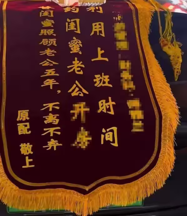 原配送上的錦旗更直白點出出軌細節,寫道「利用上班時間約閨蜜老公開酒店,替閨蜜照顧老公五年」。(視頻截圖)