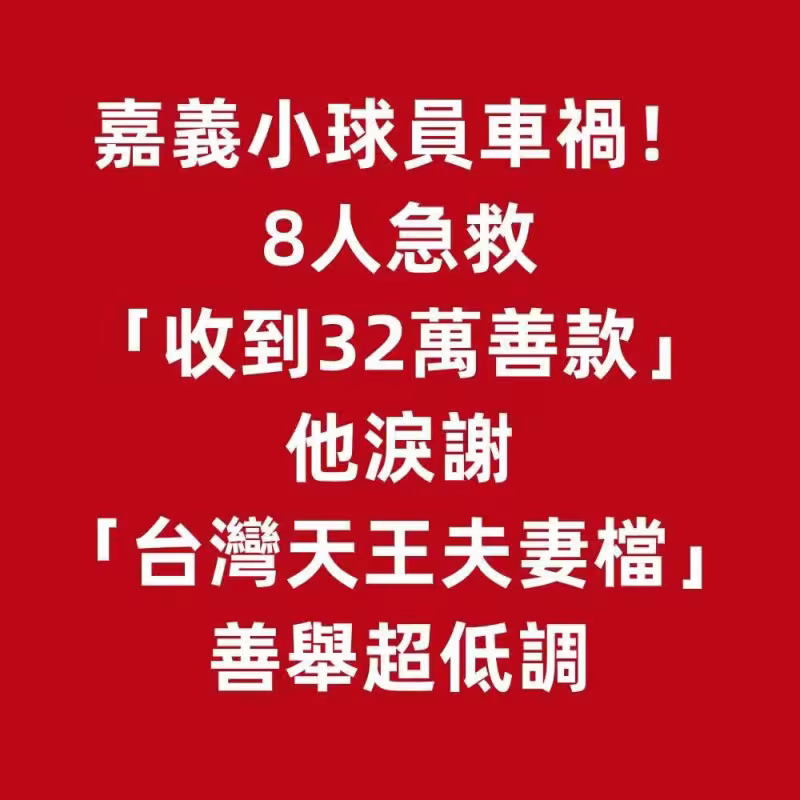 嘉義小球員車禍!8人急救「收到32萬善款」...他淚謝「台灣天王夫妻檔」善舉超低調!