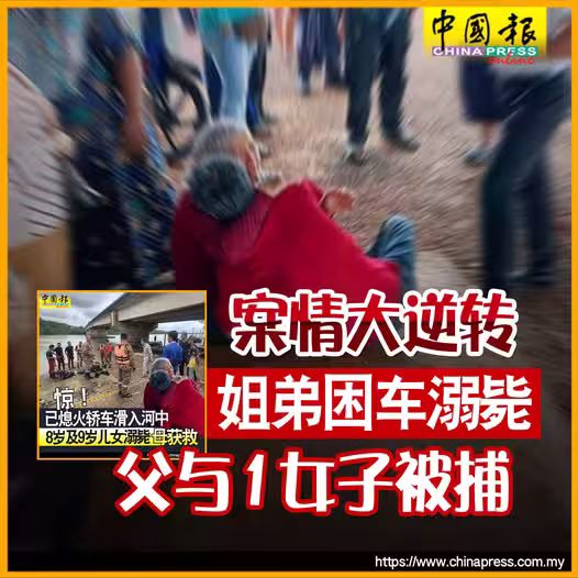 (波德申5日訊)「熄火轎車滑入河中釀2童斃命」一案有驚人大逆轉!2名小死者的父親和女伴在錄口供後被警方逮捕,同時援引刑事法典第302條文(謀殺)調查!