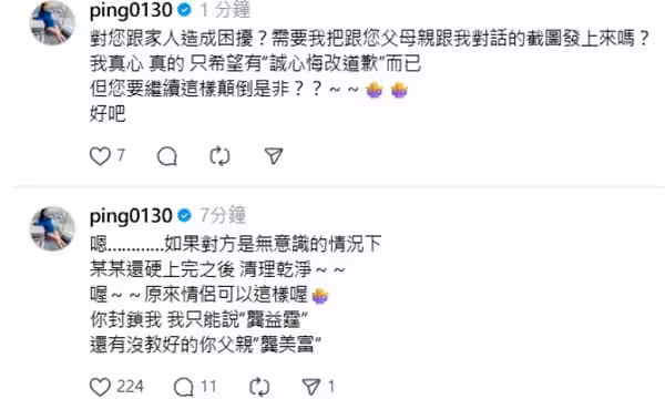 台灣女星江祖平近日在社群平台接連發文,針對三立資深副總龔美富的兒子龔益霆涉嫌性侵事件,再度表達強烈不滿。江祖平指出,手上掌握對話截圖等證據,力證自己的說法,並批評龔益霆趁對方無意識的情況下行為不當,直指「喔~~~原來情侶可以這樣喔!你封鎖我,我只能說龔益霆,還有沒教好的你父親龔美富」。