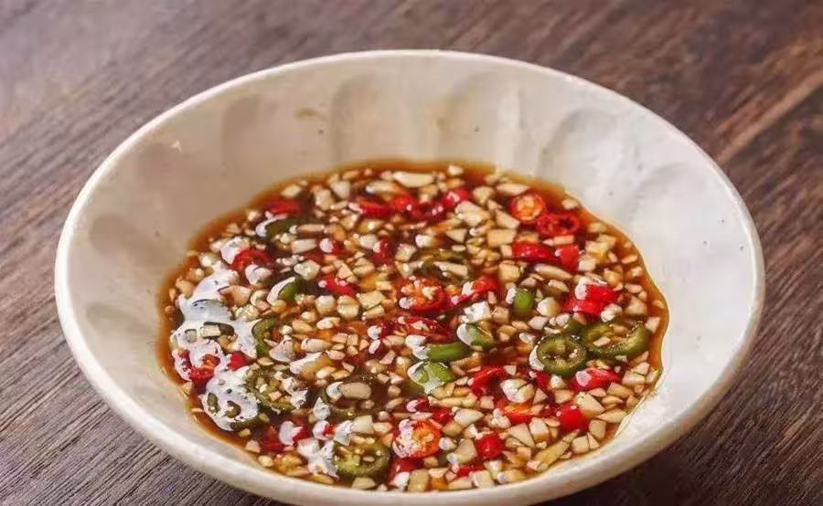 第三款是酸辣汁,需要準備杭椒粒10克、蒜粒10克、小米椒粒5克、紫林陳醋15克、生抽15克、白糖15克、鹽2克、雞精3克、芝麻油3克和蔥油20克。