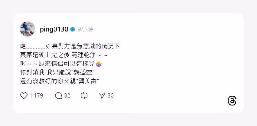 她深夜發文:「嗯…………如果對方是無意識的情況下,某某還硬上完之後,清理乾淨~~喔~原來情侶可以這樣喔。