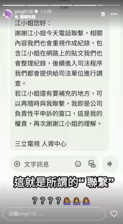 =同時江祖平也在IG限動貼出三立人資的訊息,並打上字回應「這就是聯繫?」訊息內容先感謝她的電話聯絡,相關內容會重視作成紀錄,對方說明:「後續進入司法程序我們會提供給司法單位進行調查。▲江祖平限動貼出三立電視人資中心的訊息。 (圖/翻攝自IG)