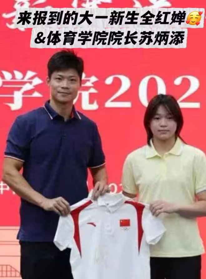 在開學歡迎儀式上,全紅嬋拿出件巴黎奧運出場服,親筆簽名,遞給蘇炳添,捐贈給體育學院。