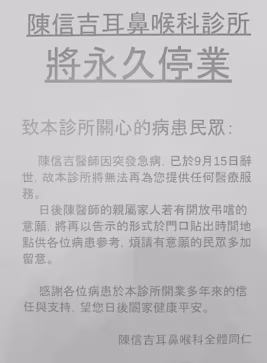 在另一個要世界好好休息喔」、「搬來中和後,一直都是看陳醫生,謝謝你,一路好走」、「感謝陳醫生總是那麼親切詳細的問診,願您在另個世界一切安好。