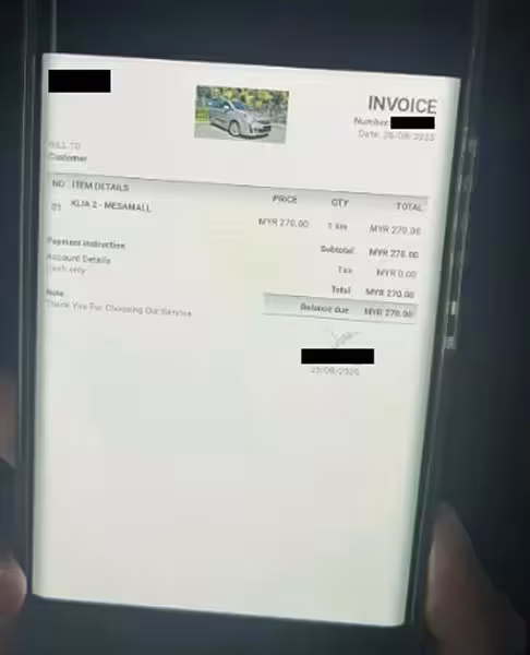 司機出示收據,要求女子支付270令吉的車費。