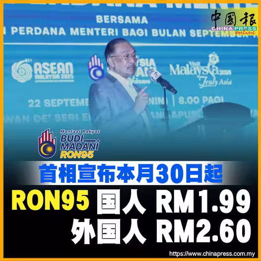首相宣布本月30日起 RON95 國人 RM1.99 外國人 RM2.60