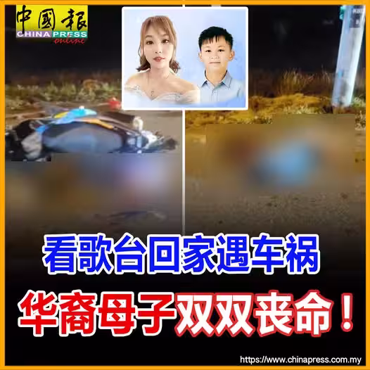 (怡保27日訊)華裔母子觀賞歌台後騎摩哆返家途中,不幸遇死神攔路,最終雙雙魂斷公路!