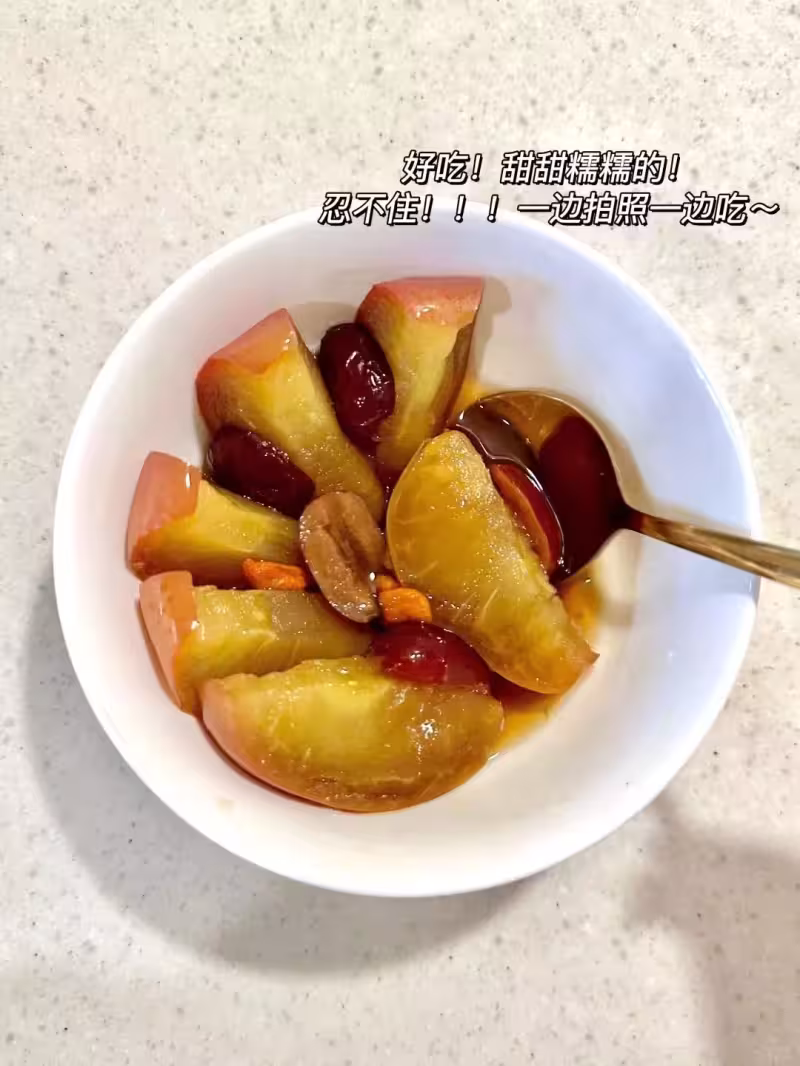 ☑️做法:蘋果不用去皮,用鹽搓洗乾淨。蘋果去核切塊和紅棗、紅糖、黃芪、枸杞一起放入碗里,加入一點點水,上鍋蒸25分鐘✅