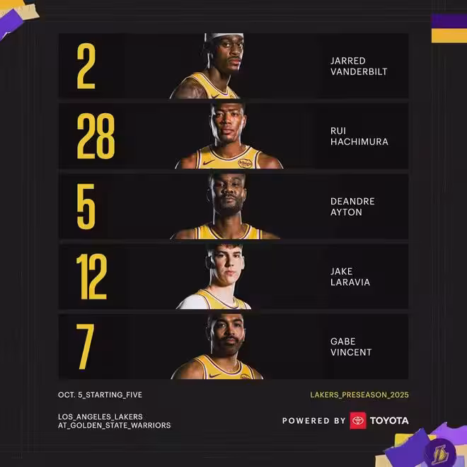 湖人首發:文森特、拉拉維亞、范德比爾特、八村塁、艾頓。勇士首發:庫里、波傑姆斯基、穆迪、巴特勒、追夢格林。老將霍福德今日替補出戰,不過常規賽開始後,霍福德會打首發。梅爾頓還在養傷,他跟賽斯-庫里今天不打。