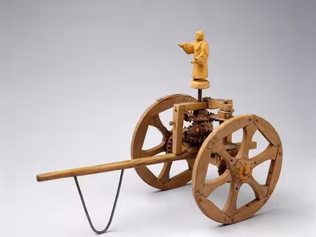 它的原理是,利用人力帶動指南車,然後車內的木製齒輪,也會隨之轉動。