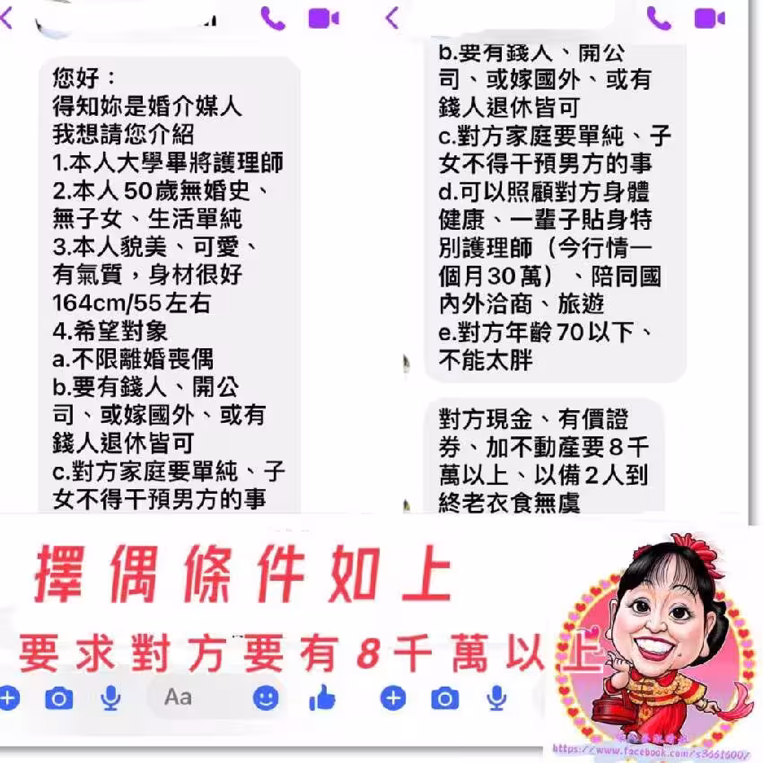 然而,女護理師的要求不只這些,她坦言男方不能太胖,年齡要在70歲以下,其現金、有價證券、不動產要有8千萬以上,以備2人能衣食無慮到終老。
