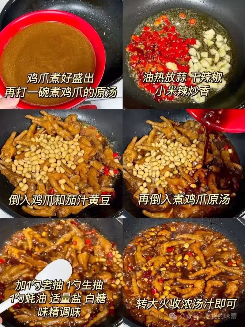 3、煮好的雞爪盛出,再留一碗煮雞爪的原湯,另起鍋熱油放小米辣、干辣椒、蒜粒炒香,放雞爪和茄汁黃豆,倒入煮雞爪的原湯,加1勺老抽、1勺生抽、1勺蚝油、適量鹽 白糖 味精調味,轉大火收濃湯汁即可