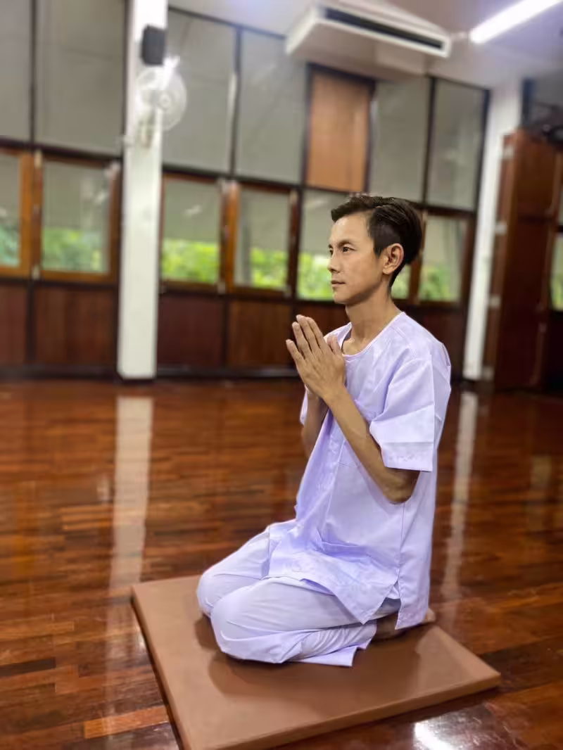 阿翔凌晨三點半被節目組從美夢中喚醒,直接帶往泰國寺廟Wat Cholpratarn Rangsarit體驗修行生活,在寺廟中,每個小時都有不同的法師帶領誦經,但他直言腦袋還沒清醒,也完全聽不懂經文內容,崩潰喊話:「身體被困在那邊,完全動彈不得......」一心挂念著後續的舞蹈表演拍攝,只能不斷看時間,想趕快恢復自由之身!
