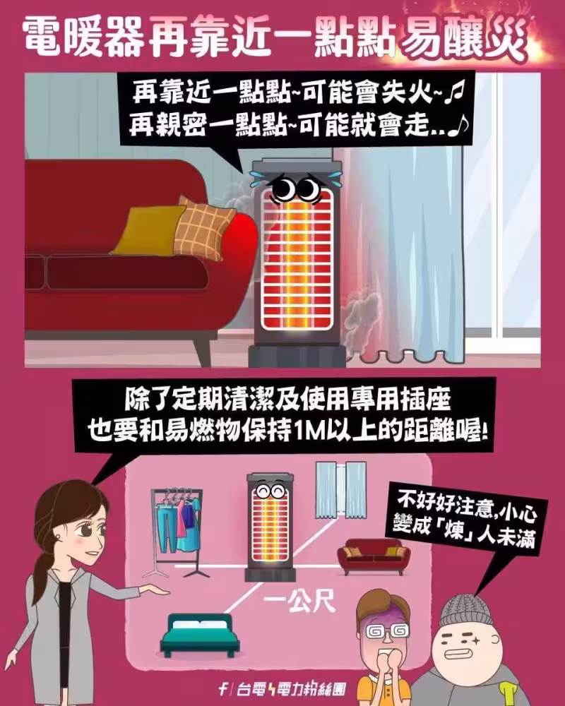 台電也提醒,千萬不要讓電暖器正對床鋪或棉被,尤其在睡覺時,更容易因長時間高溫而引發火災。