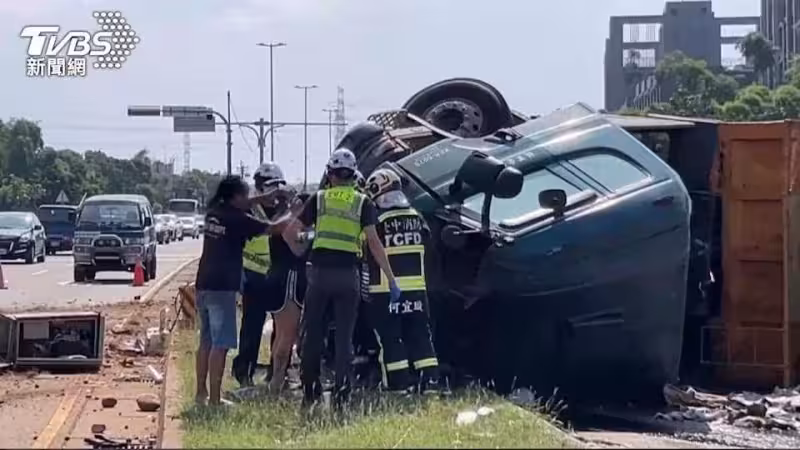 事故發生在國慶連續假期最後一天,早上10點左右,侯姓砂石車駕駛當時正載運廢材前往台中港,行經下坡路段時疑似剎車失靈。面對前方約10幾台停等紅燈的車流,駕駛當機立斷選擇自撞分隔島,導致車身橫向翻覆至對向車道,現場一片狼藉。翻覆的砂石車占據了三線車道,車上載運的廢材砂石散落一地,造成交通一度受阻。